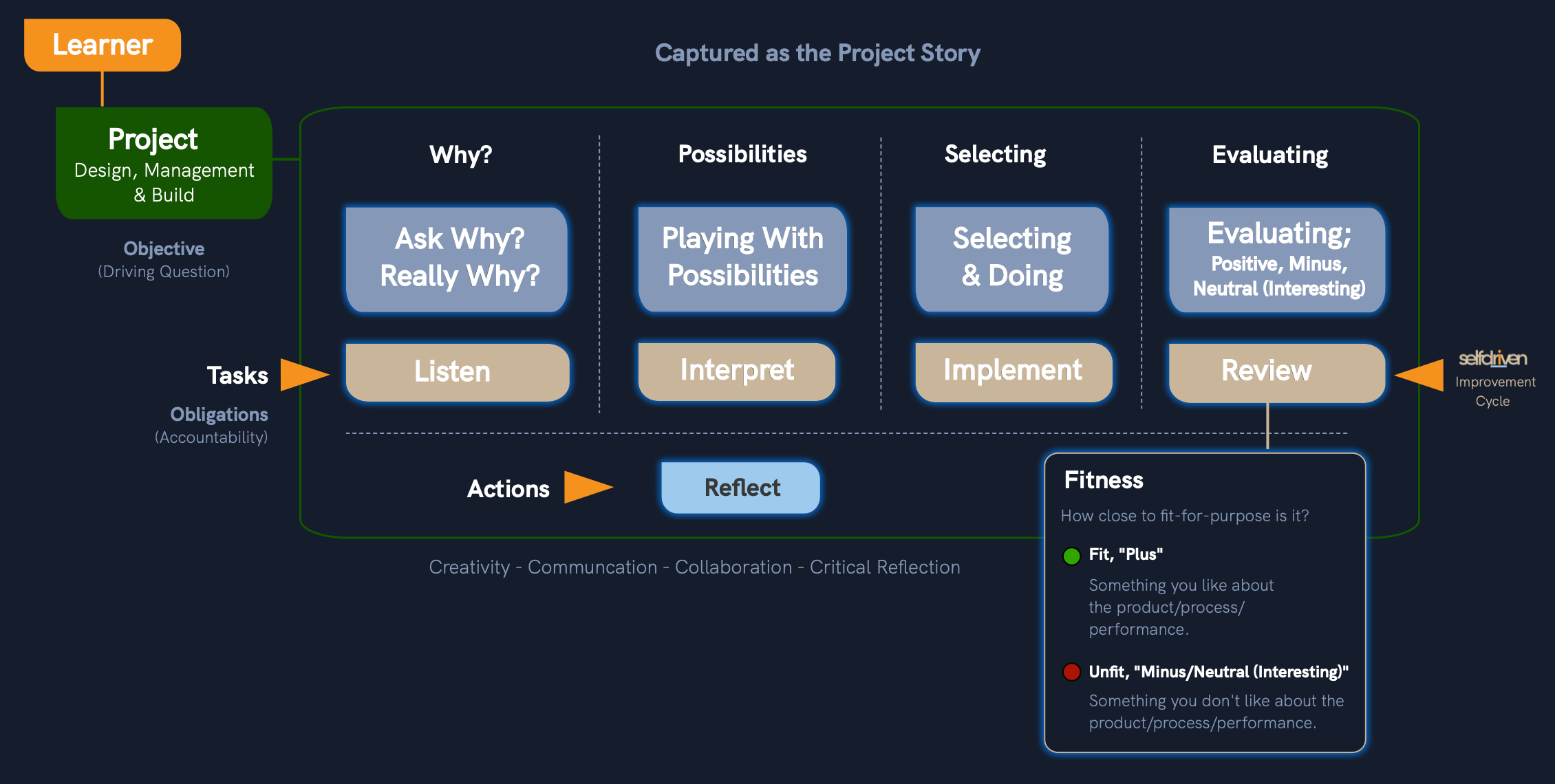 The improvement cycle and associated project/task/action management components within the selfdriven app enable project based learning (PBL).