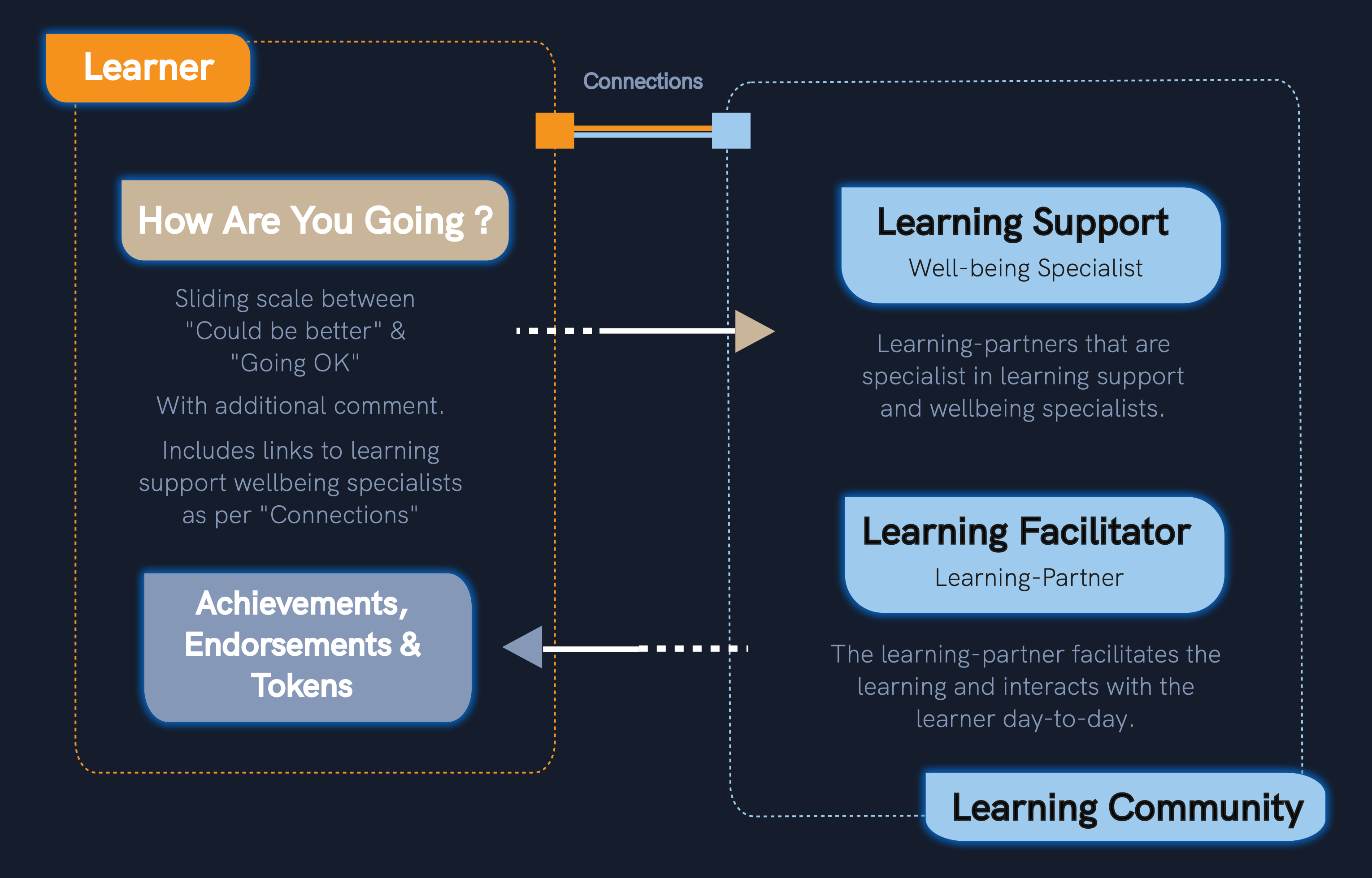 Visible and shareable recognition of growth and positive behaviour as endorsements, achievements and reflections by learning-partners.